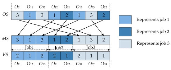 According to the scheduling requirements of machines and AGV resource constraints in a job shop, the three-level coding method was adopted. The first is the operation sequencing vector (OS), the second is the equipment selection vector (MS), and the third is the AGV transport vector (VS). In OS, each element is the index of the job, and the number of occurrences is the number of operations of the job.