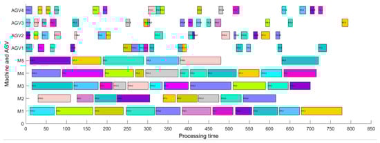 In recent years, manufacturing enterprises have actively promoted the concept of advanced intelligent manufacturing. In order to realize the transformation from a traditional manufacturing shop to intelligent shop, many manufacturing enterprises have introduced automated logistics equipment such as automatic guided vehicles (AGVs). This has made the traditional optimal allocation of manufacturing tasks, machines, and personnel gradually expand to the integrated optimization of multi-types of manufacturing resources [5]. In the actual job shop, different path choices of AGVs cause different time consumption. It will also affect the processing time, scheduling planning, and completion time of the entire production task. Therefore, flexible shop floor integrated scheduling with an AGV has gradually become one of the key research problems in the field of production scheduling optimization.
