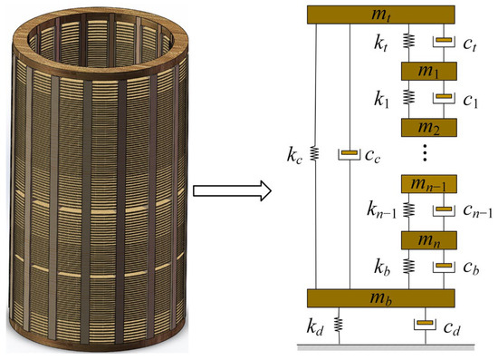 The transformer winding axial vibration system is a linear vibration system. A linear vibration system consists of mass, damping, and spring stiffness. In the system, the disks are regarded as a lumped mass, the insulating pad between the disks and the pressure plate is regarded as an elastic element, and the oil-filled area between the disks is regarded as damping. Therefore, the transformer winding can be abstracted as a “mass-damping-spring” model and the solution method of the response of the transformer winding axial vibration is an analytical method. The model is presented in Figure 1 [18].
