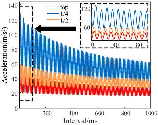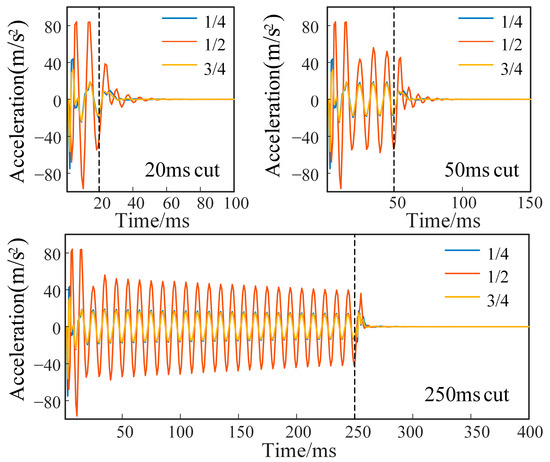 To study the effect of the short-circuit interval on winding vibration, different short-circuit cut-off times were analyzed. Three disks of different axial heights, equally spaced in the direction of the low-voltage winding axis, were taken as measurement points. The vibration acceleration is shown in Figure 5.