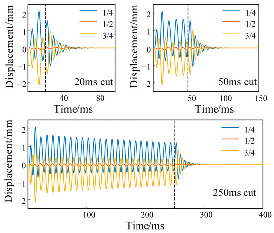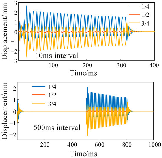 According to Figure 6, the displacement at 1/4 and 3/4 of the winding axial height is large before the circuit breaker trips and the displacement in the middle is much smaller than that in other positions. Before the action of the circuit breaker, each disk is subjected to damped forced vibration in electromagnetic excitation. After the breaker action, each disk is subjected to damped free vibration and the vibration displacement at different positions is attenuated more slowly than the acceleration amplitude.