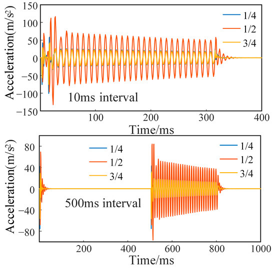 According to the vibration-acceleration-amplitude curves obtained in Figure 10 in the short-circuit interval from 0 to 1000 ms, the following characteristics of vibration response can be obtained: firstly, due to the superposition effect, the peak of the secondary vibration acceleration is higher than the peak of the primary vibration, but it continues to decay with interval increasing; secondly, the closing waiting time is 0–600 ms and the amplitude of the secondary vibration gradually decays. The amplitude of the secondary vibration becomes essentially stable within 600–1000 ms; the superposition effect is small, and the influence is not obvious.