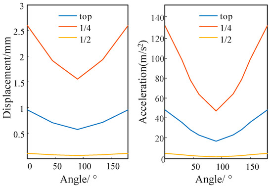After 10 ms of vibration attenuation, we selected different phase angles to continue the short-circuit closing, where the closing angle was set to different points in the 0–180° period, each separated by 20°. According to the calculated results of the reclosing short-circuit current, the current through the winding is different at different positions and decays periodically with the change of interval. The electromagnetic force is adjusted by adjusting the secondary short-circuit impulse current, following which the excitation of the winding vibration is changed. The vibration displacement and acceleration of the transformer, in different disks and at different closing phase angles, are shown in Figure 9.