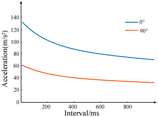 As the short-circuit interval changes, the axial vibration amplitude on the winding changes, as does the attenuation time. The peaks and valleys values in each cycle in the acceleration curve of Figure 10 were sampled and fitted, and the relationship curve between the acceleration amplitude of the secondary vibration and the reclosing interval was obtained, as shown in Figure 11.