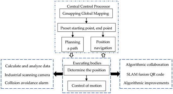 The AGV navigation and positioning system researched in this paper is characterized by a high accuracy, low latency, reduced maintenance cost and improved work efficiency. It can solve the navigation and positioning problems encountered by AGVs in practical work. According to the requirements of the actual production environment, this paper describes the improved methods and measures, and compares them with the unimproved methods and measures. Figure 1 shows the system framework diagram of AGV.