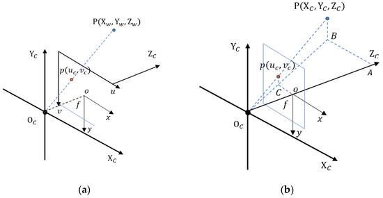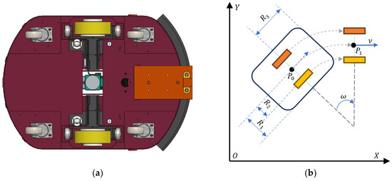 As shown in the figure, the AGV dimensions , , and are: 38 cm, 30 cm, and 46 cm, respectively. The AGV is powered by a pair of differential wheels, with two followers at the front and rear supporting the AGV body. In Figure 3b, is the linear velocity of the centre of the AGV, is the angular velocity of the AGV, and the attitude of the AGV at the moment at P0. The kinematic model of the AGV is shown in Equation (1).