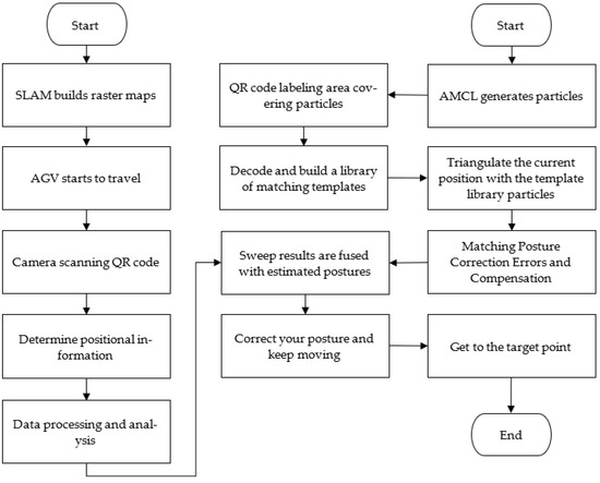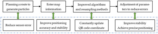 SLAM [16] is the abbreviation for “simultaneous localization and mapping,” mainly used to solve the problem of localization and map construction when a robot moves in an unknown environment. It consists of four main parts: front-end scanning and matching, back-end optimization, closed-loop detection, and map construction [17]. Gmapping is a SLAM algorithm based on laser sensors, which has high map building and positioning accuracy, and is able to build accurate maps in real time and achieve more accurate positioning [18]. AMCL localization algorithms are widely used because they are highly flexible, adaptive and can handle noise and uncertainty [19]. However, in localization, AMCL is highly dependent on the accuracy of the sensors, which will affect the accuracy of the localization if the data fails. In this paper, an enhanced AMCL based on QR code information is proposed. The improved AMCL algorithm is able to automatically adjust the weights and distributions of the particles according to the estimation error through an adaptive sampling strategy, which improves the accuracy and robustness of localization. Accurate localization is still achieved in the presence of dynamic environment and sensor errors. To meet the requirements of the real-time and positioning accuracy of visual navigation, this paper uses the QR code as a landmark. A QR code is a two-dimensional matrix composed of QR code symbols and has the advantages of a fast reading speed, large amount of information, low cost, and high reliability [20]. In the process of the AGV moving, the QR code camera at the bottom of the vehicle scans the QR code. It determines the position and attitude information of the AGV by identifying the current QR code. In this process, the angular error and positional error in the motion process are analyzed and calculated. By using various algorithms for correction and compensation, the positioning accuracy of the robot is improved to a certain extent. Based on the above problems, an improved AMCL particle localization algorithm is introduced into the SLAM fusion QR code, connecting the world coordinates of the QR code to enhance the number of particles in the AMCL algorithm, optimizing the particle sampling strategy, and improving the motion model to introduce a non-linear model to improve the localization accuracy.