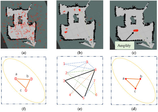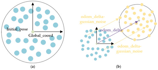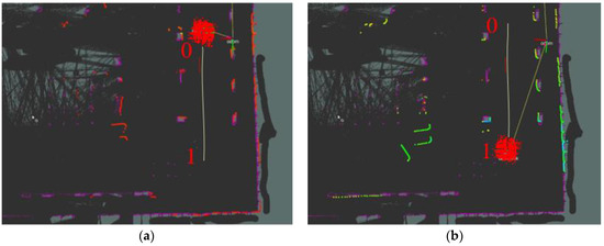 Figure 6a,b represent the particle’s position information in global coordinates and the odometer’s re-prediction of the particle’s position by Gaussian noise, respectively. Figure 7a,b represent the change in the particle weights, the size of the weights based on color discrimination and the particles with larger weights are replicated, respectively. Figure 8a–c represent the process of dividing the particles based on regions, finding particles with high weights using clustering methods, and publishing particles, respectively. From the analysis of the above steps, it can be concluded that the sampling method based on the probabilistic model is used to generate the particle swarm more evenly and uniformly. According to the weights of the particles, filter out the particles with smaller weights and copy the particles with larger weights to better cover the area where the AGV is located and improve the robustness of the algorithm. For the improved initial particle swarm optimization, this can improve the initial positioning accuracy and convergence speed of the algorithm. In addition, the improved initial particle swarm generation method can also improve the accuracy of the algorithm, enabling it to effectively locate in different environments and initial conditions.