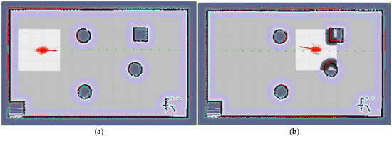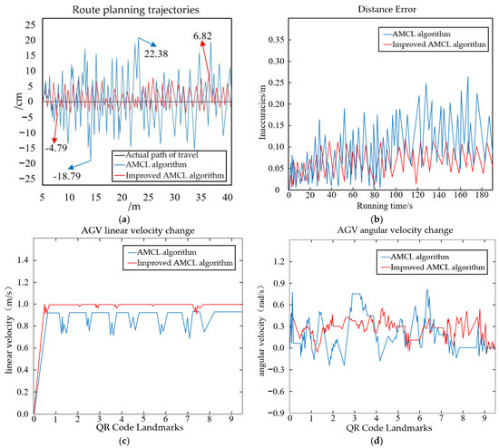 The maximum data for the offset recorded by the photoelectric sensor in Figure 20a is (−18.79, 22.38) when using the AMCL algorithm, while the improved AMCL algorithm is (−4.79, 6.82). That is to say, adjusting the trajectory to the left exceeds the set trajectory line by a maximum of 22.83 cm and 6.82 cm, and adjusting the trajectory to the right exceeds the distance by a maximum of 18.79 cm and 4.79 cm, from which the comparison can be significantly concluded that the improved algorithm is superior. Figure 20b with the increase in the running time, the error gradually increases and reaches a peak at a certain point, and then the error gradually decreases, but the adjustment time also gradually increases. In contrast, because of the addition of the algorithm to eliminate the cumulative error link, in the improved algorithm, the error will be adjusted quickly with a slight difference between the scan data and the simulation algorithm. Because of the large deviation, the velocity variation is large, the maximum velocity cannot be reached, and the velocity variation has to be adjusted in each sweep, and the fluctuation of linear and angular velocities in Figure 20c,d are fluctuate more compared to the improved AMCL algorithm. Table 4 shows the performance of different algorithms with the same conditions.