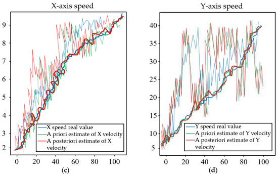 The improved algorithm was tested in the simulation by setting the initial yaw angle to 60°. The value change in the optimized algorithm, while ensuring that the rest of the parameters are the same, yields the silky smoothness of the real trajectory graph running over the time of (a) in Figure 10. The improved algorithm is better smoothed compared to the AMCL. (b) The grey lines in the figure serve as the measured data, with a large degree of deviation; the green lines serve as the modelled values, with a smaller degree of deviation; and the final filtered results are much closer to the true values, and the traces of error have converged to a minimum. From the figure, it can be concluded that the fluctuation is small and the performance is relatively smooth. The thin line represents the AMCL algorithm test results, and the thick line represents the improved AMCL algorithm test results. (c) and (d) in Figure 10 illustrate that the improved AMCL algorithm performs smoother for the fluctuation of the errors of the true value of the speed, the a priori estimate and the a posteriori estimate for different directions, the errors are within the permissible range, and the improvement of the algorithm meets the requirements and performs well.