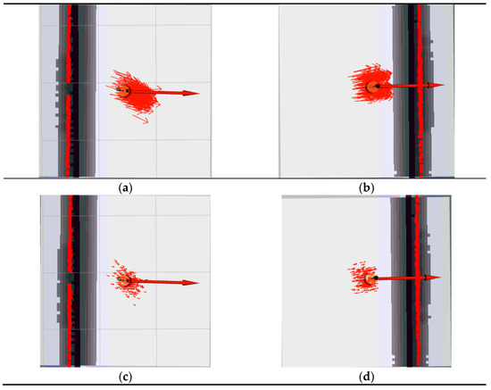 AMCL algorithm with improved AMCL algorithm particle changes: (a) AMCL algorithm for particle changes at the starting point; (b) AMCL algorithm changes of particles at the end point; (c) improved AMCL algorithm for particle changes at the starting point; (d) improved AMCL algorithm for particle changes at endpoints.
