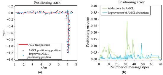 It can be learnt from the distribution of the particles that the distribution of the improved algorithm particles performs better compared to the previous algorithm, distributing on the real trajectory with less error, and the rest of the particles of the regions not involved by the AGVs disappear, only in the aggregation of the labels. From Figure 19 it can be seen that during approximately the first 30 messages released by the AMCL, the localization error is small; once 30 messages are released, the AGV is abducted to produce a large error. As the AGV moves, the positioning error gradually decreases, and after multiple messages, the error tends to 0, restoring the original positioning accuracy. Although the improved AMCL algorithm also encounters kidnapping, the adjustment time is improved by 68.73% compared to the unimproved algorithm.