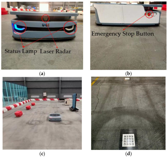 Real scene testing: (a) AGV front; (b) AGV side; (c) experimental site and AGVs used; (d) paste a column of QR code landmarks.