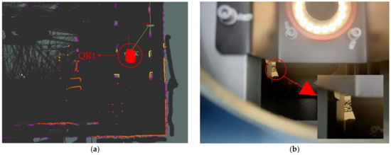 Figure 23a shows that the improved AMCL particles converge on the QR1 position, at which time, Figure 23b shows that the AGV stopping position is in the area directly above the landmark. From the actual test, it is concluded that the AGV identifies the particle template on QR1 to match the exact position of the first landmark on the SLAM construction map, and then accurately travels to the first landmark area location, waiting for the next command. At this time, the industrial camera is opened to scan the code, and the real position of the AGV at this time is obtained through coordinate conversion, comparing the coordinate information and measuring the position error interval between the particle triangular matching position information using the improved AMCL algorithm and the position error interval of the QR code scanning information.