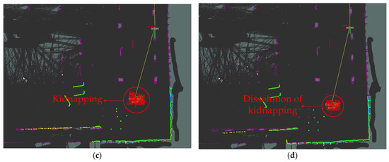 The experiments show that the particles in the AMCL algorithm will not disperse automatically after AGV is kidnapped, so it is impossible to relocate. However, the improved AMCL algorithm will scatter some particles at the kidnapped position, which can be relocated. Figure 24 shows the process of the kidnapping and location recovery of the AGV when the improved AMCL algorithm is started. Figure 24a shows the initial state of the AGV. At this time, the AGV is ready to accept the command to move forward, and the particles are in a dispersed state. Figure 24b shows the state that the AGV moves to QR2 point, at which time the particles are in a convergent state. Figure 24c shows that the AGV is kidnapped, and the particles gather in this area and do not diverge with the movement of AGV. As shown in Figure 24d, to detect the kidnapping event, the improved algorithm is adjusted and the positioning state is restored. To calculate the kidnapping time, calculate the duration of the kidnapping time based on the start time and end time of the kidnapping event. To monitor the positioning error, sensors or other positioning systems are used to monitor the difference between the actual position of the AGV and the position estimated by the AMCL algorithm. When the positioning error exceeds a certain threshold, it can be determined that an kidnapping event has occurred. Record the start time of the abduction event. When the positioning error exceeds the threshold, record the current time as the start time of the kidnapping event. To monitor the positioning recovery, continue to monitor the positioning error, and when the positioning error recovers to within an acceptable range, it can be judged that the kidnapping event is over.