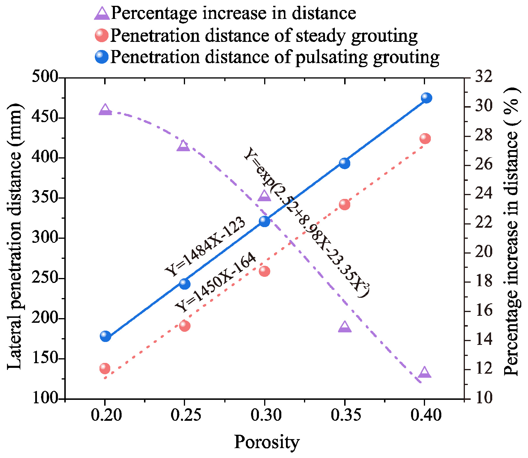 In this section, the effect of various working conditions (porosity, average particle size, viscosity, grouting pipe length, and back pressure) on the penetration distance is discussed. Figure 9 and Figure 10 show the effect of porosity on penetration distance. The percentage increase in distance is defined as