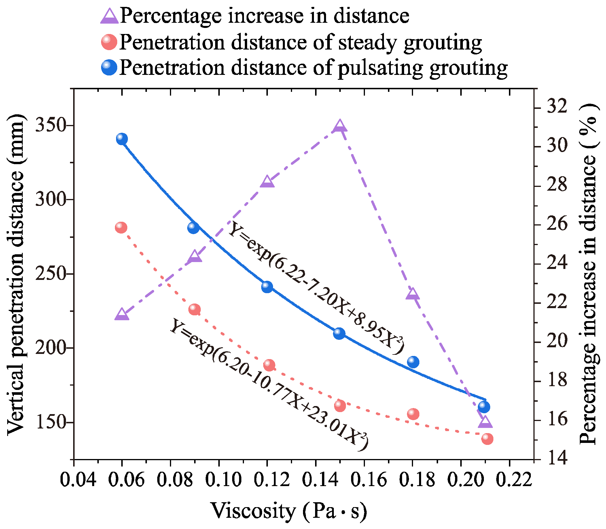 Figure 13 and Figure 14 present the effect of viscosity on penetration behavior. As viscosity increases, the lateral penetration distance of pulsating grouting decreases from 549 mm to 294 mm, with the expression Y = exp (6.78 − 9.09X + 18.696X2). Similarly, the penetration distance for steady pressure grouting decreases from 430 mm to 242 mm, with the expression Y = exp (6.52 − 8.92X + 19.18X2). With the increase in viscosity, the percentage increase in distance gradually increases, which also demonstrates that pulsating grouting can achieve better performance in high-resistance conditions. As shown in Figure 14, the vertical penetration distance of pulsating grouting and steady grouting exhibits an exponential decrease. However, the percentage increase in distance follows a pattern of initially increasing and then decreasing. This is also due to the low resistance in the annular space. When the slurry viscosity is high, more slurry flows into the annular space under the influence of pulsating pressure.