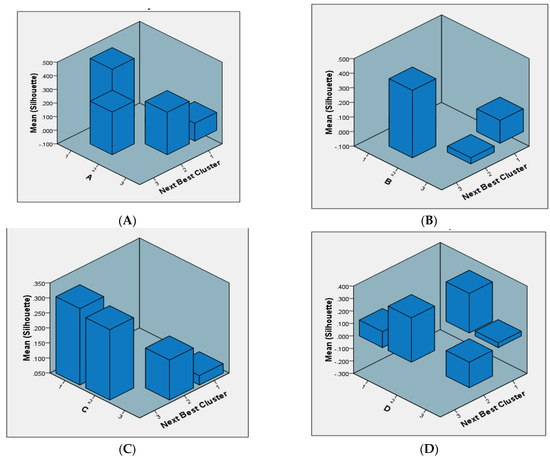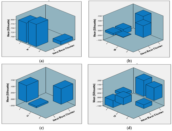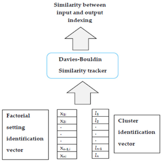 It is the ‘naïve processing’ tactic that enters at this point in the stigmergic data analysis procedure. As suggested previously, the Xj vectors in an OA planner provide a mapping of where in the output identification vector, Id, the bionically clustered members ought to be located, if the partitions are separated enough to distinguish among the cluster centers. Thus, the tactic here is to find out whether the output partitioning of the multi-response dataset is similar to the rule (OA scheduler) that was imposed to create them (Figure 1). If the number of controlling factors is m, then, there should be m times the application of the proposed similarity measure estimations between the factorial vectors and the partitioned output vector sequence. The Davies–Bouldin cluster separation measure [85] is adopted for this proposed methodology because of its two attractive features: (1) the measure does not depend on the number of the examined clusters, and (2) the measure is not affected by the method that is deployed to cluster the multi-response dataset. Since the Davies–Bouldin index is used to quantify the appropriateness of the partitions against the dataset, it may also be applied to infer the appropriateness of the partitions against the rule of the factorial (OA) vectors. For that matter, the comparison becomes meaningful since the unsupervised and bionically clustered sequence is synchronously rated against a standard measure stick. Thus, the efficacy of the investigated controlling factors is easily contrasted by the magnitude of the Davies–Bouldin index. The smaller the Davies–Bouldin index value is, the sharper the separation among the clusters may appear to be.