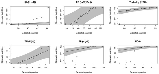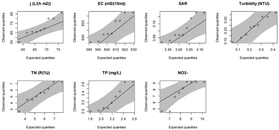 In Figure 2, boxplot depictions of the ultrafiltration process characteristics are shown for immediate comparison. It became obvious that out of the seven responses, at least three (permeate flux, electrical conductivity and SAR) strongly deviated from a typical symmetrical distribution. It was only the turbidity data that apparently conformed to a symmetrical shape. Empirically, this implies that computing location and dispersion estimates for screening and prediction purposes might require the involvement of more sophisticated data manipulation treatments. Definitely, a second round of visual data screening using the bean plot option offered more detailed data structure properties (Figure 3). The symmetrical portrayal of the turbidity data was then more transparent. Due to the small data size, it was also noted that the total nitrogen data spread could be described by an approximate normal distribution. However, the remaining five responses exhibited diverse types of non-normal behaviors that might not even exclude bimodality; the marked data location was often situated between two discerned modes. Of course, a data screening phase may not be complete without a QQ plot presentation of the tendencies for the seven output characteristics. As shown in Figure 4, the QQ plots for the permeate flux, the SAR and the NO3− concentration responses displayed the presence of outlier points with respect to the drawn 95% confidence bands. It was noticed that the band width at the two response extremes—for all seven graphs—was marginally separated. For instance, it can be seen that for the case of the QQ plot for the permeate flux data, the two band ends could overlap, which might suggest a mild or no effect. The QQ plots for the electrical conductivity and the SAR data revealed a highly unbalanced dispersal of their respective data points around their fitted line; this was in agreement with the conclusions reached from the two previous graphical screenings.
