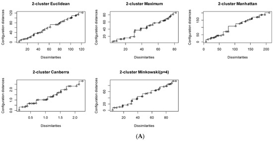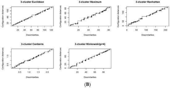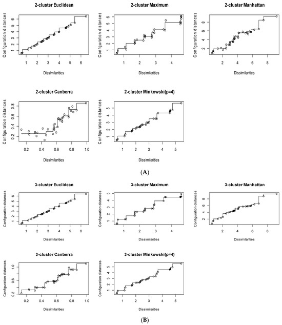 Shepard graphs of the five tested distance measures for two-cluster (A) and three-cluster configurations (B) (nanofiltration process characteristics).