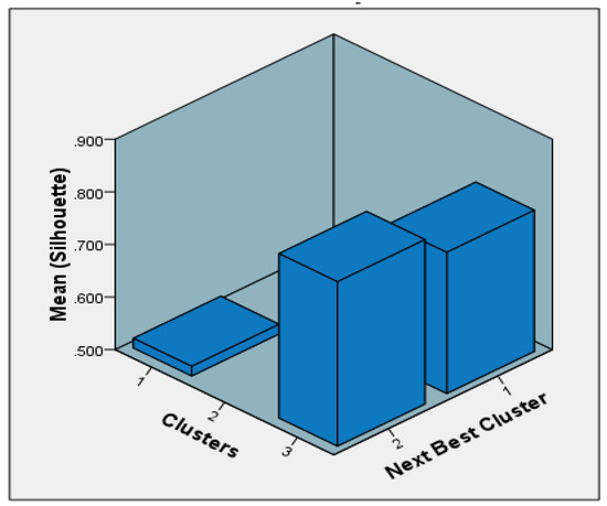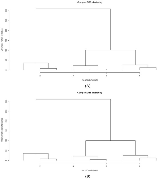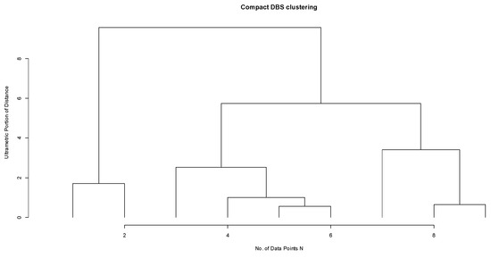 The candidate distance measures that were indicatively selected to be tested were (1) the Euclidean distance, (2) the maximum/Chebyshev distance, (3) the Manhattan distance, (4) the Canberra distance and (5) the Minkowski distance. For the Minkowski distance, the model parameter p was fitted at a value of 4. Two-cluster and three-cluster configurations were evaluated to examine the linear and non-linear dependencies on the four controlling factors. From Section 3.2.1, the participating ultrafiltration process characteristics in the clustering assignment were (1) the turbidity, (2) the total nitrogen content and (3) the NO3 content. Shepard graphs were prepared and are contrasted in Figure 8 to provide quick visual evidence. It appeared that for both preset cluster sizes, the Euclidean distance measure provided the most satisfying representation of the relationship between the configuration distances and the dissimilarities. However, it was not easily discerned whether the two- or three-cluster setting was more accurate in delineating this behavior. Therefore, the Kruskal stress estimations for all five distance measures and the two cluster sizes are tabulated in Table 6. Ostensibly, the three-cluster setting was favored by the fitting performances of all five distance measures. However, the best performance was witnessed for the Euclidean distance measure, since the Kruskal stress estimate was minimized at a value of 4.66 × 10−14. Thus, the decision was to apply the Databionic unsupervised classifier by adjusting it to utilize the Euclidean distance measure and to deliver clustering hierarchies, which were set up for a three-tier solution.