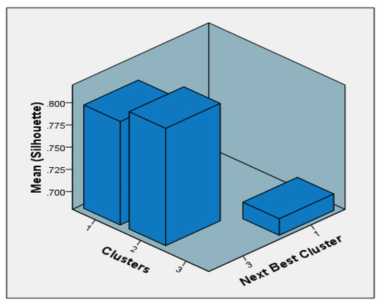 The same procedure was repeated for the nanofiltration process as in the preceding sub-section. The same five distance measures and the two cluster sizes were assessed for the nanofiltration process characteristics that were nominated from Section 3.2.2, i.e., the electrical conductivity, the NO3 content and the total nitrogen content. The two- and three-cluster configurations of the dataset in terms of the Shepard graphs are depicted in Figure 9. While the Euclidean distance measure still provided a tighter fit between the configuration distances and the dissimilarities for the two-cluster case, the Manhattan, Canberra and Minkowski (p = 4) distance measures competed fairly well with each other. To make this distinction more accurate, the Kruskal stress estimates for all five distance measures and the two cluster sizes are tabulated in Table 7. Again, it was observed that the three-cluster setting option led to lower Kruskal stress values for the Manhattan, Canberra and Minkowski (p = 4) distance measures. However, the minimum estimated Kruskal stress value was 5.42 × 10−14. It was obtained in the case of a two-cluster setting when a Euclidean distance measure was considered; it was not distinguishably different from the three-cluster size setting.