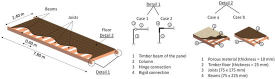 A timber floor panel consisting of glued laminated elements (beams, joins, and floor) is investigated in this study. The dimensions of the panel have been defined to ensure appropriate implementation and transport conditions so its width is fixed at 2.40 m, and its length at 7.8 m. Each panel consists of two main glulam beams (75 × 225 mm) in the longitudinal direction, thirteen glulam joists in the transversal direction (75 × 175 mm) with a spaceman of 0.60 m, and a 25 mm of timber floor that connects the beams (Figure 1). The beams of this panel are the parts that are connected with the vertical elements of the structure (columns, facades, etc.). In this study, the panel is investigated for two connection types (see detail 1 of Figure 1), as the connection’s stiffness can vary [4,18]. In addition, the case study examines the effects of the porous material on the floor of the panel in order to damp the vibroacoustic response of the structure (see detail 2 of Figure 1). The timber material of the main parts of this floor panels is categorized in the class GL24h, but experimental tests have been conducted by the authors of the present study (see Section 2.2).