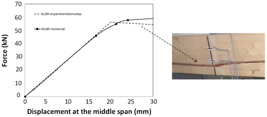 The comparison of the experimental results with the numerical ones in terms of force–displacement curves are illustrated in Figure 3. The difference between the experimental and the numerical results for displacements after the maximum bending strength is related to the structural adhesives between the layers of glued laminated timber and its failure mode (detachment of layers), which were not modeled in the present study. This work is focused on small floor displacements, in the elastic domain, so the outcomes are not affected.