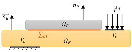 We consider an elastic structure occupying the domain , clamped on its boundary , and subject to external forces on its boundary (Figure 4). A poroelastic layer of domain is fixed to the elastic structure in order to dampen its sound radiation. The structure–poroelastic interface is denoted . , and represent the exterior normals of the structure and poroelastic domains, respectively. The effects of gravity are neglected.