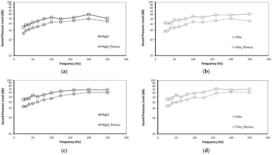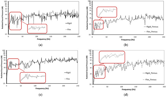 Comparison of a radiated sound pressure in the narrow band for rigid and hinge connection for (a) panel submitted to load walking, (b) panel submitted to load walking with porous material, (c) panel submitted to washing machine load, and (d) panel with porous material submitted to washing machine load.