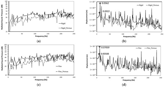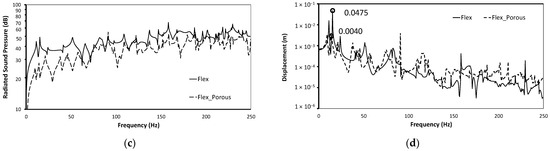 Figure 7a,c and Figure 8a,c present a comprehensive comparison, in narrow band representation, of the radiated sound pressure, while Figure 7b,d and Figure 8b,d show the vertical displacement at the middle point of the panel for two loading scenarios: the load walking and the washing machine loading, respectively. These figures reveal prominent max-amplitude peaks at specific frequencies, corresponding to the critical eigenfrequencies of the panel. These identified max-amplitude peaks represent the panel’s vibroacoustic response, indicating the frequencies where it exhibits its most significant vibrational and acoustic behavior. Both displacement and radiated acoustic pressure reach their peak at these specific eigenfrequencies, resulting in amplified vibrations and increased radiated-noise levels. The introduction of the porous material in the panel design leads to notable improvements in the vibroacoustic characteristics. One key observation is the slight shift in the critical eigenfrequencies caused by the presence of the porous layer. This shift indicates that the porous material influences the panel’s natural frequencies, potentially altering its modal behavior. Furthermore, the porous material acts as a shock absorber, effectively dampening vibrations within the panel structure, which leads to reduced sound radiation.