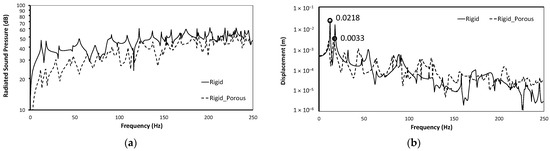 In this section, the effects of the porous material on the vibroacoustic response of the system are presented. Porous materials with open cells consist of an elastic or rigid frame which is surrounded by air. The porosity, , is the ratio of the air volume, inside the sample, to the total volume, occupied by the porous material. Table 4 describes the main properties of the porous material that were used in this study [33,34].