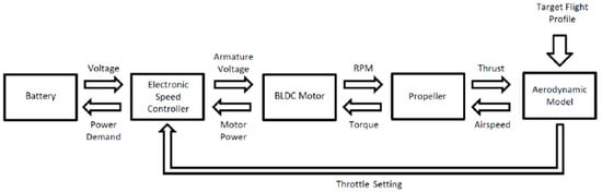 The propulsion system of a UAV plays a critical role as it consumes a significant portion of the onboard power. Its main purpose is to convert stored electrical energy into mechanical power, which propels the UAV through the motor propeller system called a propulsion unit. In fact, the propulsion system can constitute more than half of the total weight of the UAV. Figure 3 provides a typical schematic diagram of a UAV propulsion system. The power from the onboard sources is supplied to the DC bus through unidirectional and bidirectional converters, allowing for battery charging and discharging. These converters enable control over the power flow and receive control signals from the energy management system (EMS), which manages power distribution. Among the various motor types utilized in small UAVs, the brushless DC (BLDC) motor is widely preferred. This motor type offers significant advantages, including high efficiency and power density [65], as well as features such as high speed, favorable torque characteristics, reliability, ease of control via electronic speed controllers, ESCs, and long lifespan [66]. While induction motors are cost-effective and robust, they have limitations such as relatively low efficiency, cooling challenges, and lower torque output.