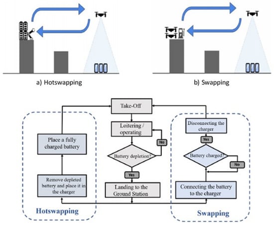 The technique known as swapping is employed to recharge the batteries of a UAV while it is in the midst of its mission. This process involves the exchange of depleted batteries with fully charged ones, which can be performed either autonomously or with human intervention. A specific type of swapping, called hot swapping, enables the immediate replacement of a depleted battery with a fully charged one, allowing the UAV to maintain power and continue its operation without interruption. Subsequently, the UAV can return to its assigned operational area and resume its tasks. By deploying multiple UAVs and coordinating their actions, a multi-agent system can ensure uninterrupted coverage of a specific area [34]. To successfully carry out a swapping operation, three important conditions must be fulfilled: (1) the presence of a ground recharge station where UAVs can land for battery charging or replacement, (2) a group of UAVs capable of continuous operation, and (3) a management system that facilitates cooperation among the swarm of UAVs. Figure 4 illustrates the techniques of swapping and hot swapping.