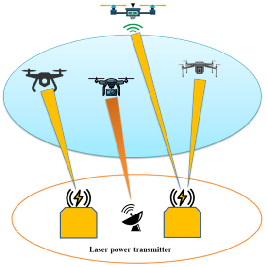 The swapping approach has shown promise in extending the operational time of battery-powered UAVs by utilizing ground stations for battery replacement or recharging. However, an alternative approach that has been proposed is wireless recharging, as discussed in the previous literature [51,85]. This method involves a ground station equipped with a primary power source, which generates a laser beam transmitted to the UAV while it is in flight. The UAV has an embedded optical receiver that converts the light into electricity, effectively powering the UAV. With wireless recharging, UAVs can remain airborne indefinitely without the need to land for battery recharging. When recharging is necessary, the UAV can access an aerial power link area to receive energy. This approach enhances safety by eliminating risks associated with take-off and landing. Laser transmitters can be strategically positioned on tall building rooftops to ensure an unobstructed laser beam path, or they can be installed on a mobile station, as depicted in Figure 5. This establishes a radiative link between the UAV and the nearest energy source, enabling fast power transfer. Companies like LaserMotive (Washington, DC, USA) have developed working prototypes capable of transferring hundreds of watts of power [54]. Furthermore, experiments described in [53] have demonstrated the feasibility of this technique, achieving flight times of over 12 h for a quadcopter. Wireless recharging offers the potential for continuous operation and extended flight durations, addressing limitations associated with battery capacity and swapping cycles. However, further research and development efforts are necessary to optimize the technology and overcome challenges related to power efficiency, safety, and scalability.