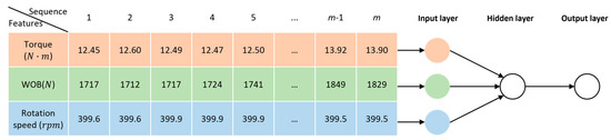 26]. The data were recorded at a frequency of 100 Hz, with an interval of 10 ms between each group of collected sensor data. The rotational speeds were set at 400 rpm and 600 rpm to collect different torque and WOB data. Core drilling was conducted for a total of 8 granite samples and 6 concrete samples, which generated a total of 40 sets of drilling data samples comprising 18 sets of granite drilling data samples and 22 sets of concrete drilling data samples. As discussed, each sample set included 4900 data points for torque, WOB, and rotational speed. Accordingly, the experiments included 40 × 4900 × 3 = 588,000 data entries. Among these, 16 sets of granite drilling data samples and 16 sets of concrete drilling data samples were applied for a total of 32 sets of drilling data samples as the training dataset, and 4 sets of granite drilling data samples and 4 sets of concrete drilling data samples were applied for a total of 8 sets of drilling data samples as the testing dataset. Equal numbers of drilling data samples were extracted under the friction and cutting states in all datasets. The classification experiments were conducted on a personal computer with a Core i7-9700K CPU, a NVIDIA GeForce RTX 3060Ti GPU, and 32 GB of RAM.