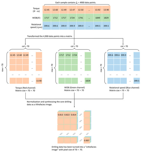 Figure 3, these three data channels can be transformed into three square matrices based on 70 × 70 = 4900 data points, and then combined into a single three-channel data structure analogous to a lithofacies image.