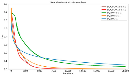 Table 3. The results demonstrate that the 14,700-8-3-1 network structure provides a relatively ideal learning condition because the training time cost is approximately half that of the most complex model with very nearly the same effectiveness, as indicated by the final loss value obtained after 20,000 iterations. Accordingly, this network structure is capable of effectively representing and detecting the key input data features and exhibits high stability and convergence capability. Therefore, the 14,700-8-3-1 network structure was applied in all subsequent experiments.