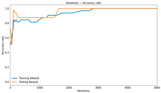 For illustrative purposes, we applied both the training and testing datasets in the training process, and the accuracy rates obtained at each iteration according to Equation (7) are presented in