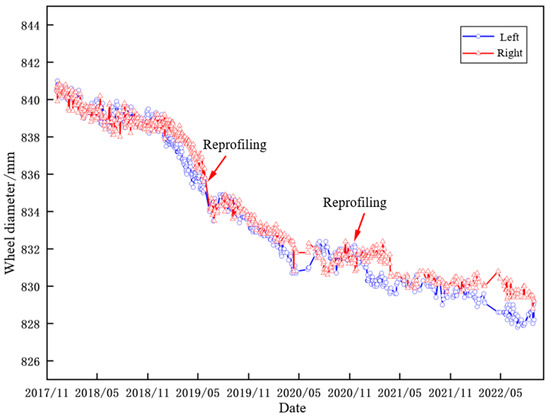 - Zhu, W.; Yang, D.; Guo, Z.; Huang, J.; Huang, Y. Data-driven wheel wear modeling and reprofiling strategy optimization for metro systems. Transp. Res. Rec. 2015, 2476, 67–76. [Google Scholar] [CrossRef]
