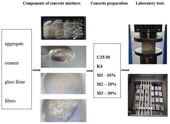 The analyzed microstructure of M1–M3 concrete samples containing additions of polymer fibers and glass flour has shown that the addition of larger amounts of glass flour as a substitute for cement might cause problems with the compaction of the concrete mix, as observed in the M3 sample. This is probably due to the decrease in the workability of concrete mix caused by the increase in water demand from glass flour.