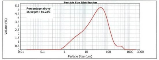 As a partial replacement for cement, glass flour was used in amounts of 10, 20, and 30%. Flour is a product that is made by grinding and shredding glass into very fine particles, which gives it a light, powdery consistency but still has a relatively high density compared to some other building materials such as cement or sand. The density of the glass flour is 2.4 g/cm3. Figure 2 shows the grain size of the glass meal.