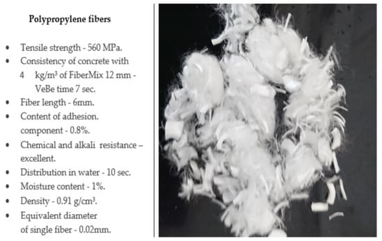 Polypropylene fibers were also used to strengthen the concrete structure. Polypropylene fibers extruded from polypropylene granulate/polymeric material (CH2CH(CH)3), bundled and cut in accordance with EN 14889-2:2006 (Bautech sp.zo.o Piaseczno near Warsaw, Poland) were also used for the tests. In the concrete mix, they form a three-dimensional supporting network resistant to gravity, thanks to which they maintain a constant level of concrete, prevent cracks, reduce plastic shrinkage, and limit the formation of shrinkage scratches []. Figure 3 shows the fibers and their characteristics.