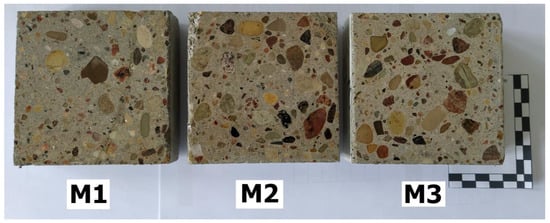 Three types of concrete containing polymer fibers and various amounts of glass flour (samples M1, M2, and M3) were prepared for Scanning Electron Microscope (SEM) examinations. At the first stage, from 10 × 10 × 10 cm concrete cubes, a thick slice from the middle section was cut perpendicular to the trowelling surface for each type of material. In this way, surfaces were grinded and polished. Cut and pre-polished sections of polymer composites are presented in Figure 4.