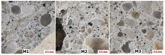 Observed in the cement matrix of the M1 sample, several spherical air voids might be the cause of the observed slight increase in freeze/thaw resistance of this concrete. Although the amount of air voids was too low to make concrete fully resistant to this type of aggression, in the microstructures of other samples (M2 and M3), this type of air void was not observed. In the microstructure of the M3 sample, there were observed areas with high porosity and cracks, which might decrease freeze/thaw resistance even more.