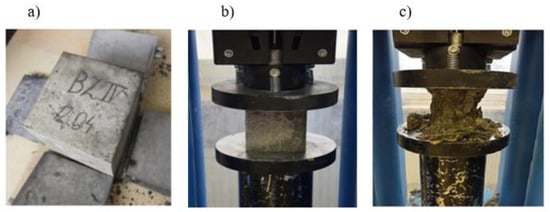 The compressive strength test fc was performed after 28, 56, and 90 days of maturation in the hydraulic testing machine H011 Matest (Italy). Based on the obtained average strengths, the result was converted into cubic samples with a side of 15 cm, and the concrete class was determined.