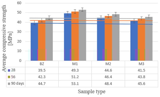 Analyzing Figure 8, after 28 days of maturation, the highest compressive strength of 49.3 MPa was obtained by concrete in which cement was converted in the amount of 10% to flour, while the lowest strength of 39.5 MPa was achieved by reference concrete. Compared to BZ concrete, the increase was 24.8%. The highest compressive strength after 56 days, equal to 51.2 MPa and after 90 days, equal to 53.1 MPa was also obtained by concrete, in which the flour content accounted for 10%. However, the lowest compressive strength after 56 days of maturation, equal to 42.3 MPa and after 90 days, equal to 44.7 MPa, was obtained by BZ reference concrete. In relation to BZ, the increase in strength amounted to 21.0 and 18.8%, respectively. Replacing cement with glass flour with fibers increased strength over time compared to comparative concrete without an additive.