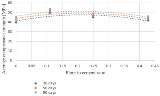 Figure 9 shows the relationship between the average compressive strength of concrete and the ratio of glass flour to cement in concrete, while Table 6 shows the obtained equations of dependencies.