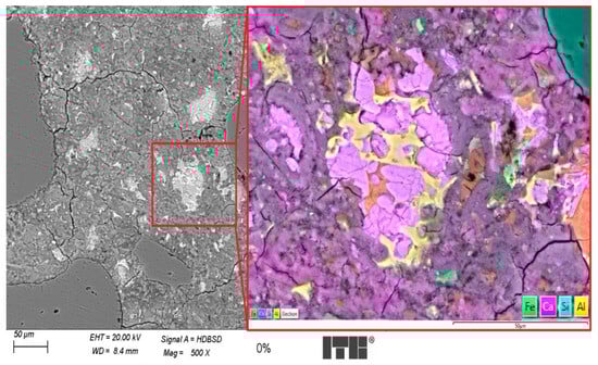 The observed microstructure of the transition zone between grains of glass flour and cement matrix was mostly sealed with several cracks. The diffusion of silicon ions into the cement matrix and calcium ions in the opposite direction was observed, as shown on Figure 17 as a blue/pink halo.