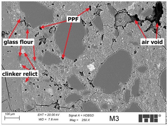 In the cement matrix of M1–M3 samples, grains of clinker relicts were observed, along with glass flour and polymer fibers with a diameter of about 30 μm. Also, some grains of GGBS (ground granulated blast furnace slag) were observed. Some of the GBBS might be present in the CEM I cement as a minor constituent, according to the EN 197-1 standard. Comparing the microstructure of M1-M2-M3, it was observed that by increasing the content of glass flour in the cement matrix instead of a part of cement, the cement matrix became more porous and cracked. Especially when comparing the M2 and M3 samples. In the M3 sample, there were observed areas with high porosity, probably caused by the difficulties with the compaction of the samples during molding. In the M3 sample, the C-S-H gel was more porous than in other samples, which might be caused by the lower content of clinker in the cement matrix. The C-S-H phase was sealed and well developed in M1 and M2 samples, especially in areas located near the clinker relicts. Some regular spherical air voids were observed in the M1 sample.